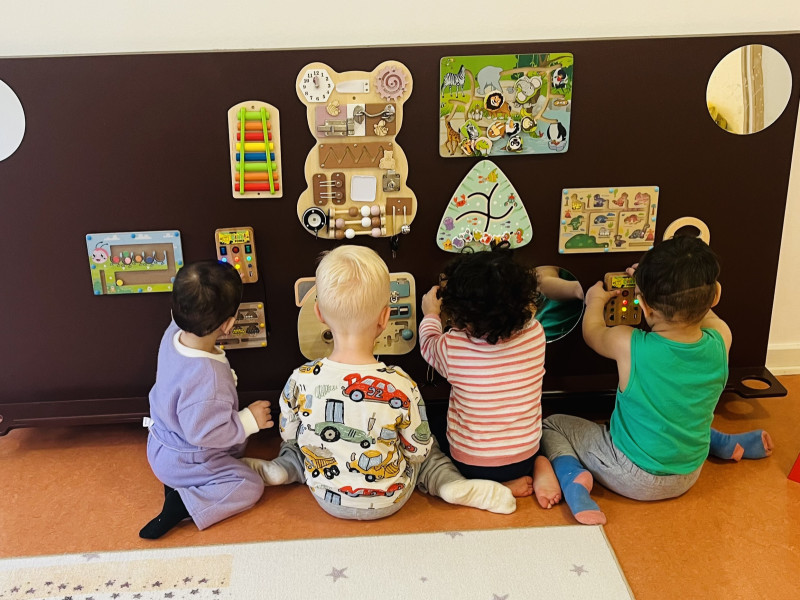 Kinder haben besondere Bedürfnisse an die Einrichtung: der Waschbereich hat einen Wickeltisch, niedrige Waschbecken und eine separate Toilette. Für den Mittagsschlaf oder um sich auszuruhen gibt es den Schlafbereich mit einer eigenen Matratze für jedes Kind. Die Küche ist besonders wichtig: hier bereiten wir – auch oft gemeinsam mit den Kindern – die Mahlzeiten zu und lassen es uns zusammen am großen Tisch schmecken. In den Räumen gibt es verschiedene Bereiche zum Basteln, Spielen oder Toben.